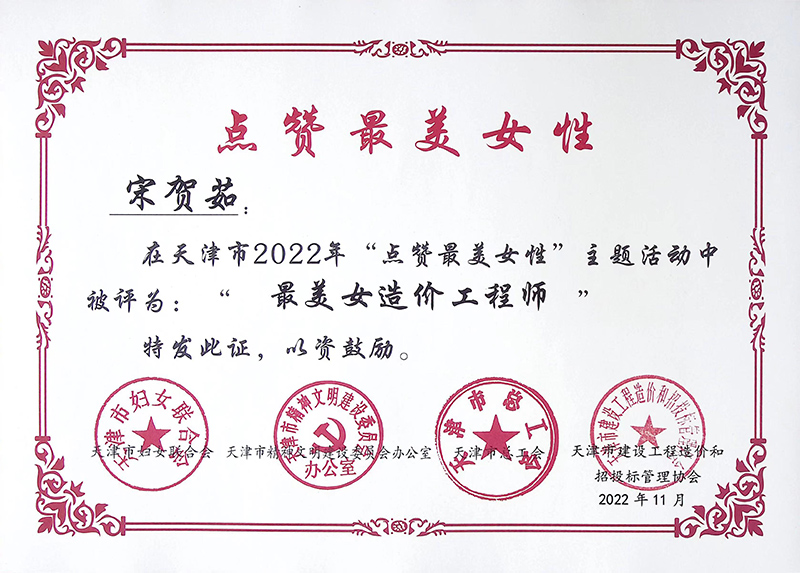 在“三八”國際勞動婦女節到來之際,從天津市泛亞工程咨詢有限公司傳來喜訊:在市婦聯、市文明辦、市總工會、津價招協聯合開展的天津市2022年“點贊最美女性”主題活動中,泛亞公司造價三部部門經理宋賀茹榮獲“最美女造價工程師”稱號。