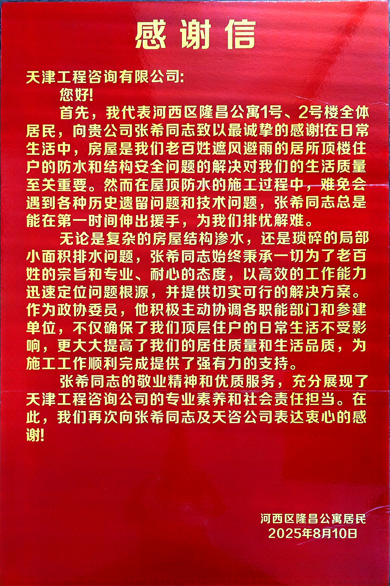 為有效促進(jìn)工程進(jìn)展,項(xiàng)目團(tuán)隊(duì)主動加強(qiáng)與居民、街道和社區(qū)的多層次溝通。在各小區(qū)設(shè)立聯(lián)絡(luò)點(diǎn),及時公開施工與監(jiān)理信息,迅速響應(yīng)居民關(guān)切。如隆昌公寓屋面滲水問題,團(tuán)隊(duì)僅用三天便協(xié)調(diào)解決,展現(xiàn)出高效務(wù)實(shí)的作風(fēng)。施工前主動告知計劃,協(xié)助居民做好防護(hù),合理安排作業(yè)時間避開休息時段,還為年長體弱居民提供搬運(yùn)幫助。這些細(xì)致入微的服務(wù)贏得了居民的廣泛贊譽(yù),特地送來感謝信,表揚(yáng)團(tuán)隊(duì)“專業(yè)、耐心、高效”。