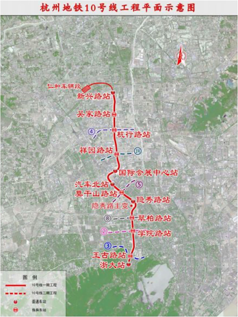 項目建設(shè)規(guī)模規(guī)模10號線一期工程起于浙大站,沿浙大路→玉古路→學(xué)院路→余杭塘河邊→莫干山路→石祥路→杭行路→勾仁大道敷設(shè),終止于新興路站,線路全長15.92公里,設(shè)置站點12座,全部為地下線,平均站間距1407.21米。10號線一期工程可與地鐵2、3、4、5、14等5條線路形成換乘。
